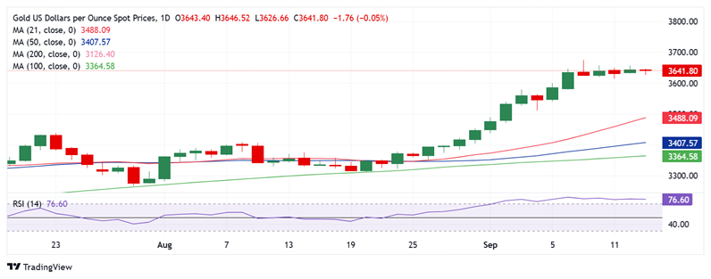 24K99讯 周一(9月15日)亚市尾盘,现货黄金基本持稳,目前金价位于3643美元/盎司附近。FXStreet高级分析师Dhwani Mehta撰文,对金价技术走势进行分析。